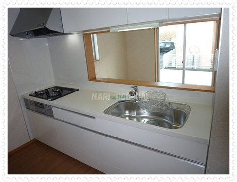 こちらはキッチン。清潔感のある白を基調としております。対面キッチンになっているので、お子様の様子も見ながら料理の準備ができます。またお子様が成長されたら、一緒にお手伝いして、お菓子作りなんかも出来ますね!